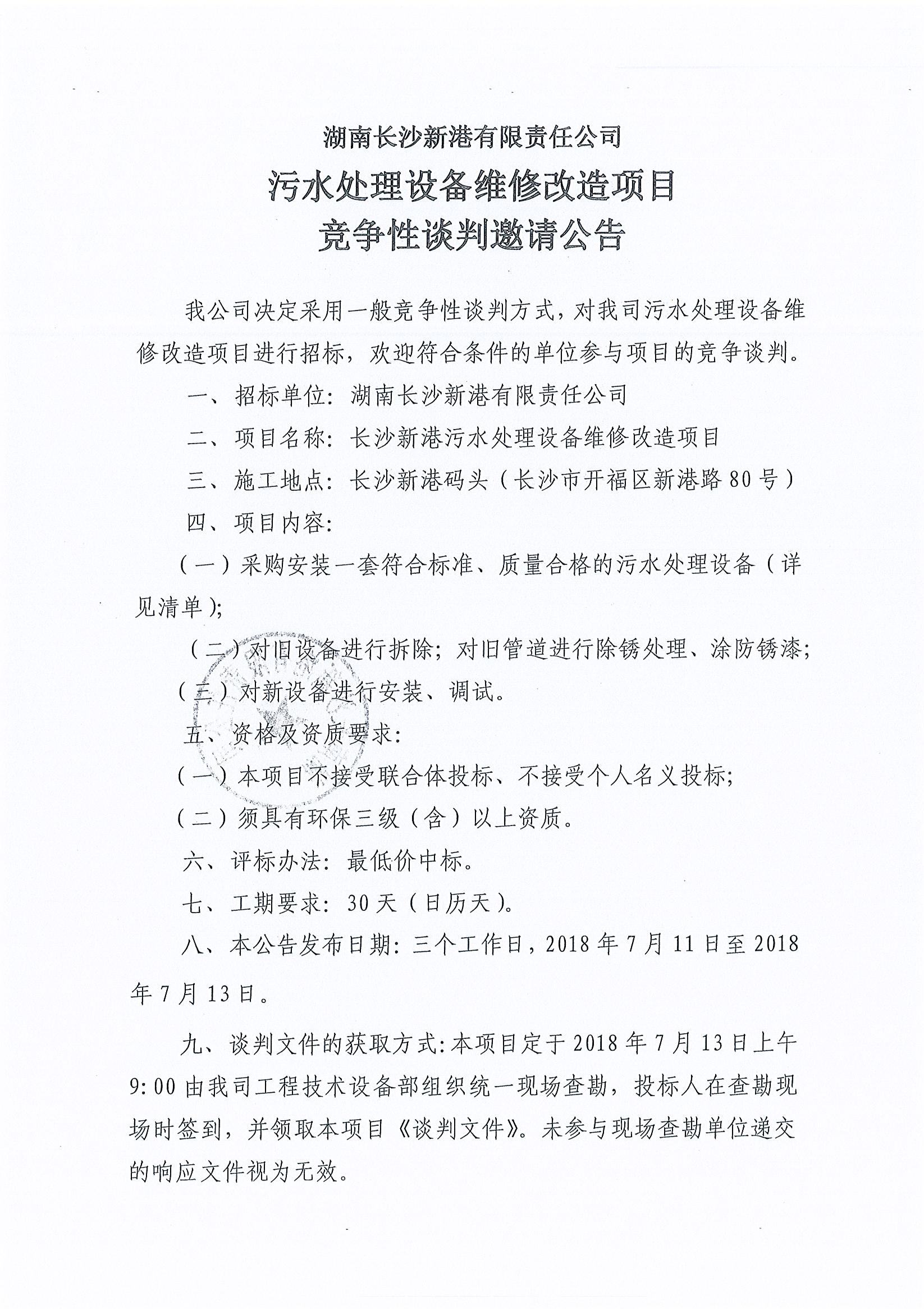 湖南長(cháng)沙新港有限責任公司 污水處理設備維修項目競爭性談判邀請公告