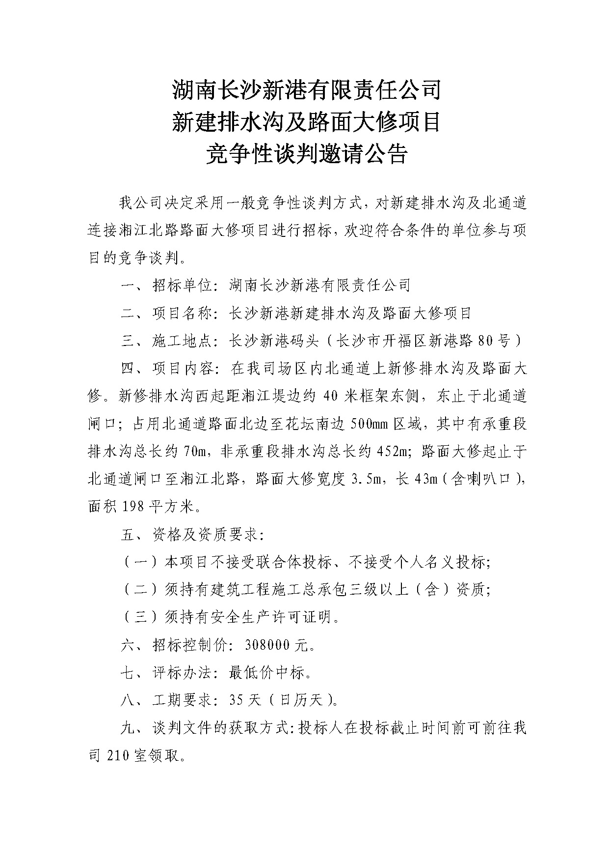 湖南長(cháng)沙新港有限責任公司新建排水溝及路面大修項目邀請公告(延期)