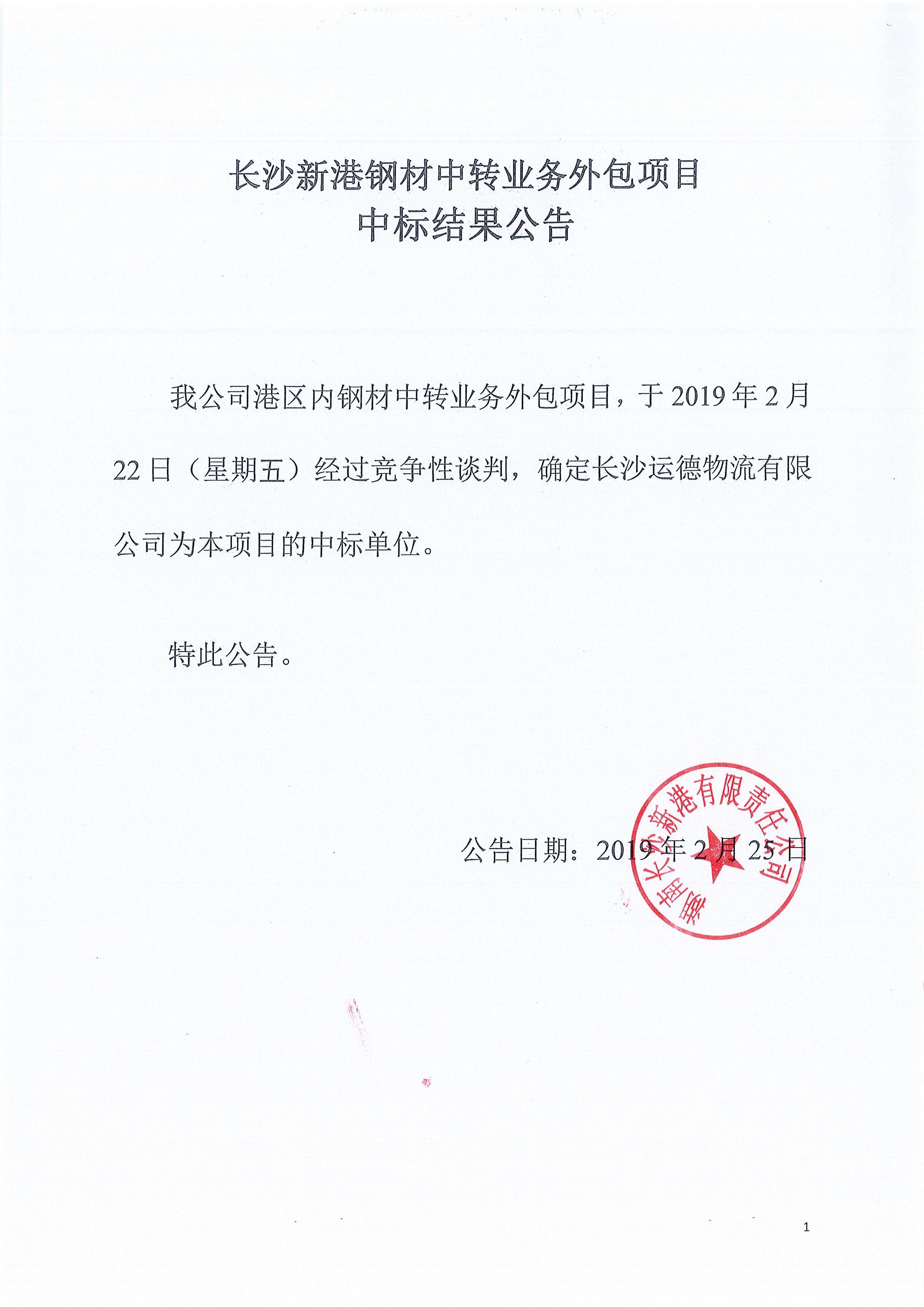 長(cháng)沙新港鋼材中轉業(yè)務(wù)外包項目中標結果公告