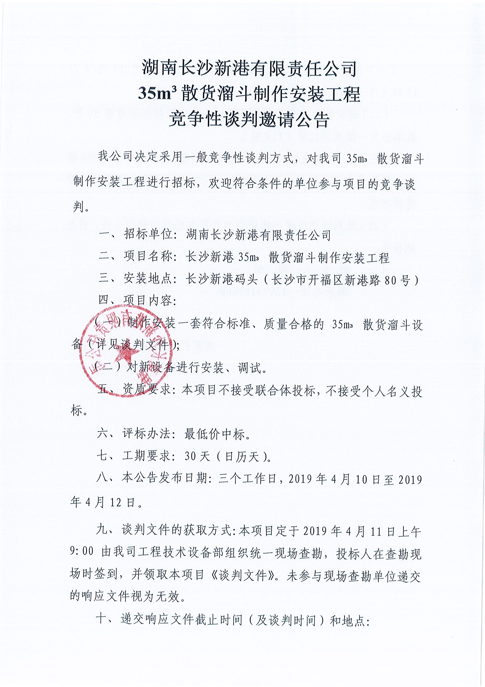 湖南長(cháng)沙新港有限責任公司35m³散貨溜斗制作安裝工程競爭性談判邀請公告