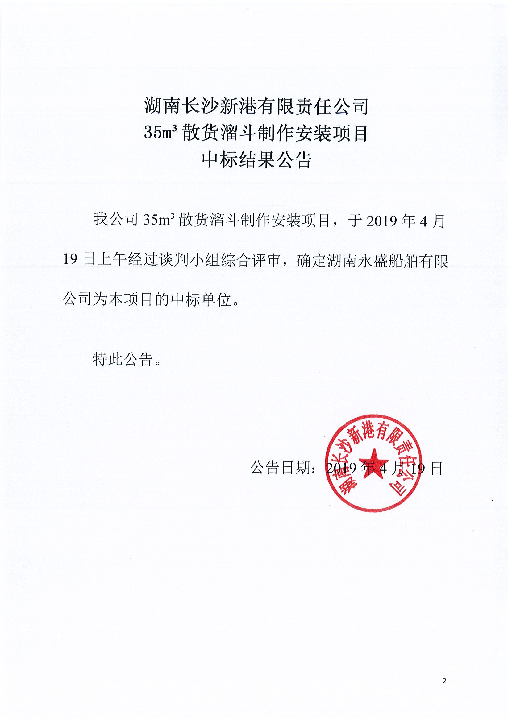 湖南長(cháng)沙新港有限責任公司35m³散貨溜斗制作安裝項目中標結果公告