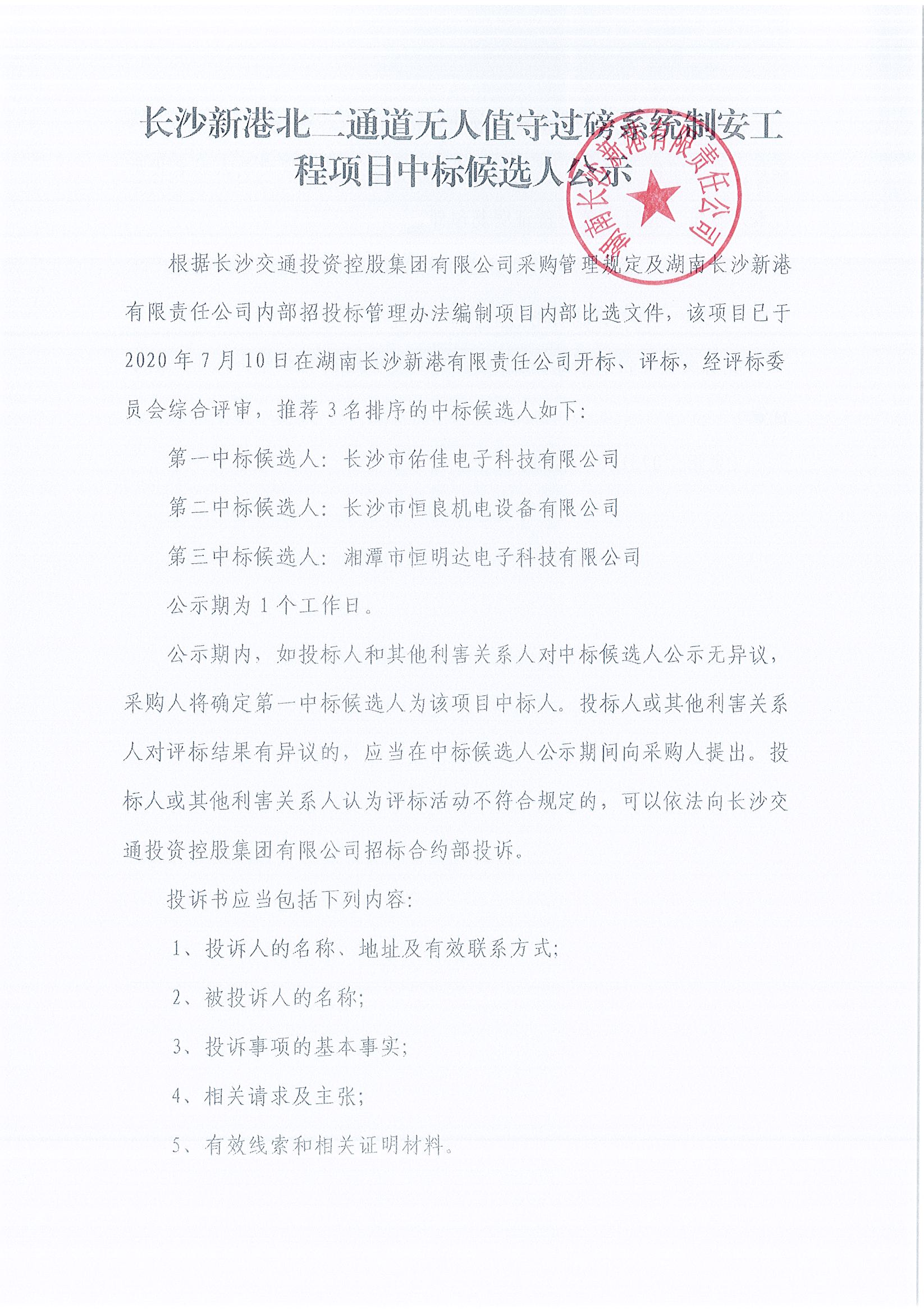 長(cháng)沙新港北二通道無(wú)人值守過(guò)磅系統制安工程項目中標候選人公示