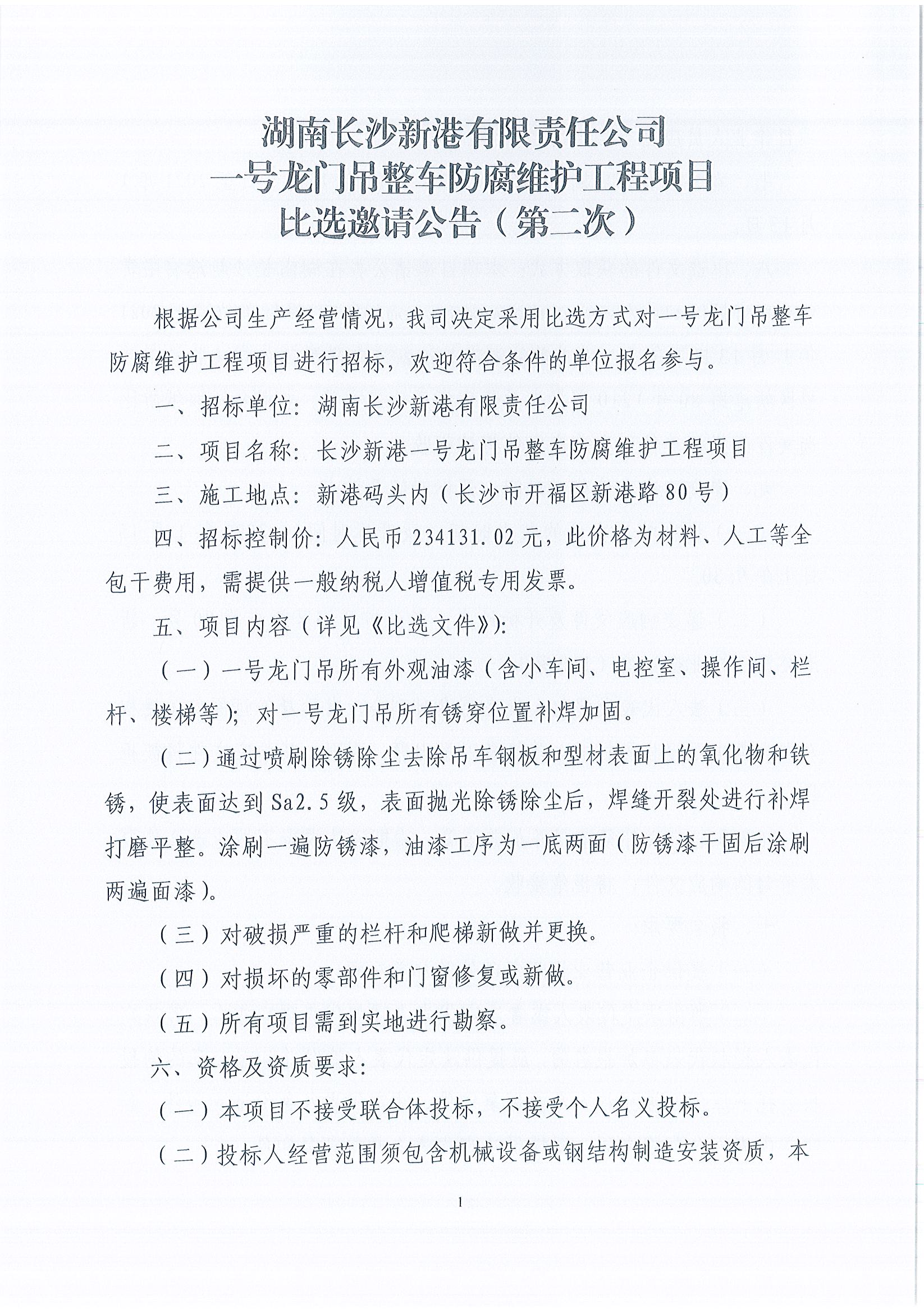 湖南長(cháng)沙新港有限責任公司一號龍門(mén)吊整車(chē)防腐維護工程比選邀請公告(第二次)