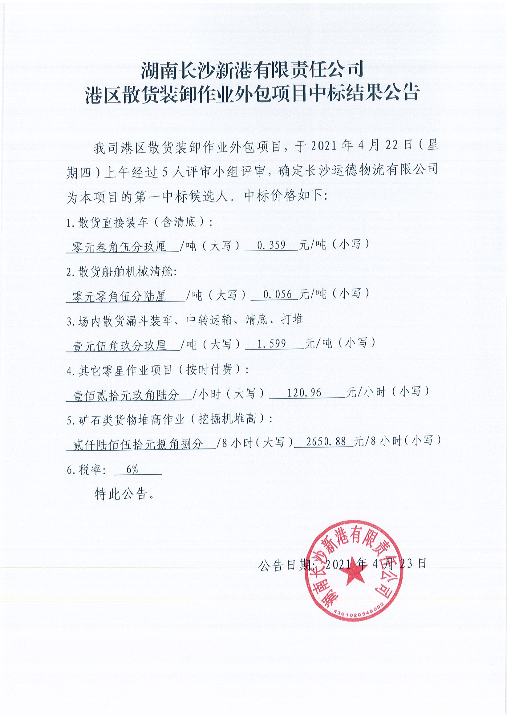湖南長(cháng)沙新港有限責任公司港區散貨裝卸作業(yè)外包項目中標結果公告
