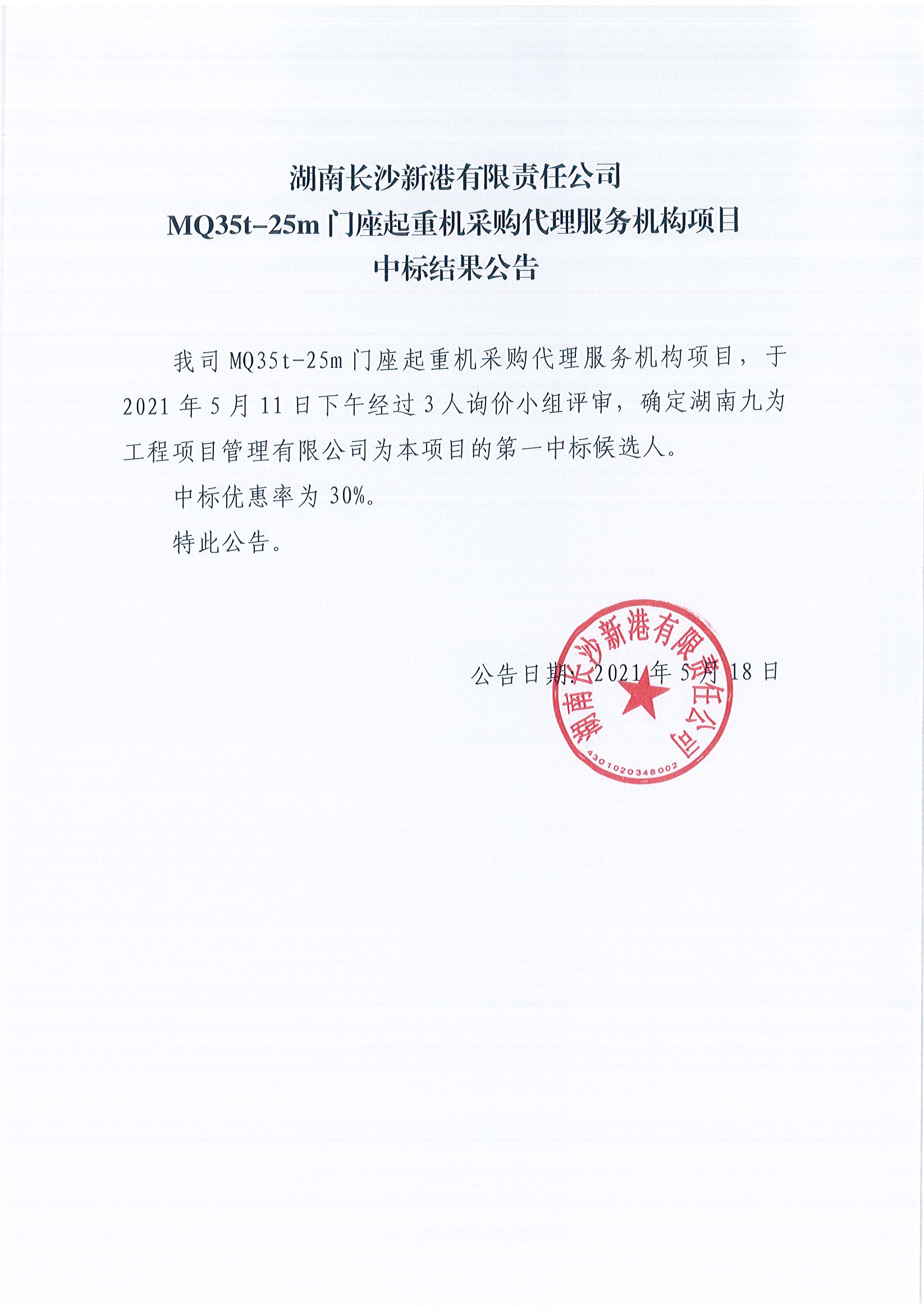 湖南長(cháng)沙新港有限責任公司MQ35t-25m門(mén)座起重機采購代理服務(wù)機構項目中標結果公告