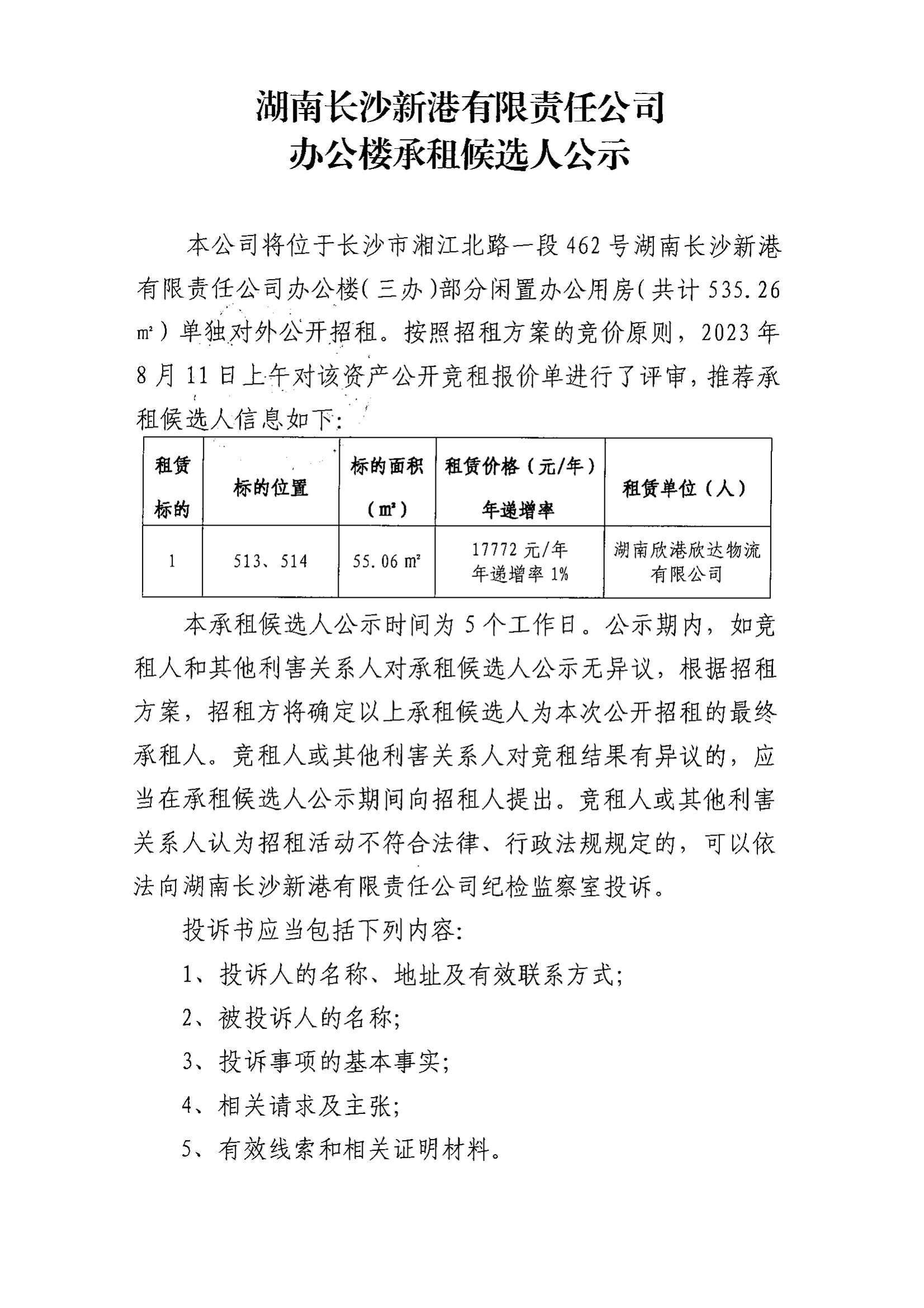 湖南長(cháng)沙新港有限責任公司辦公樓承租候選人公示