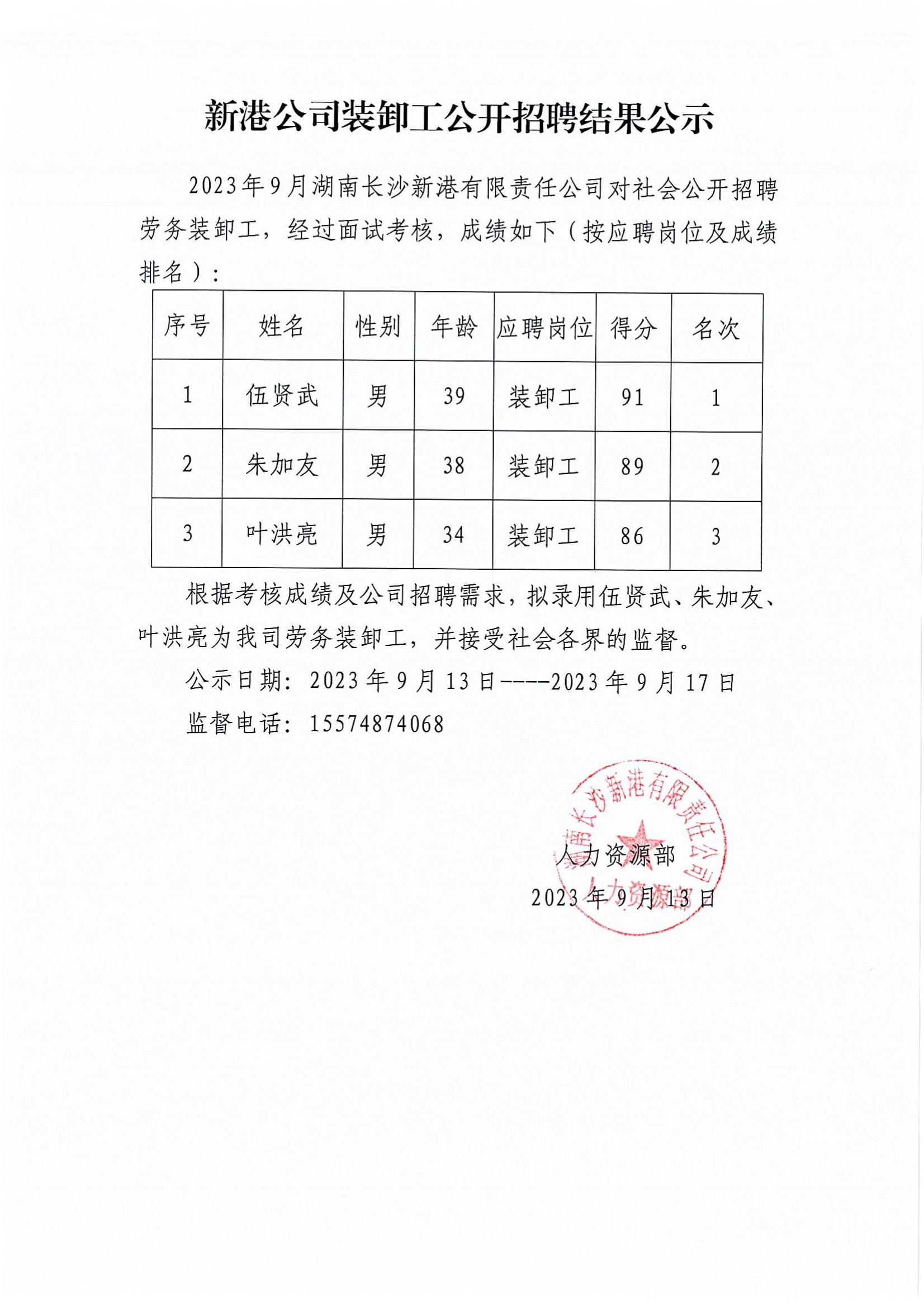 新港公司裝卸工公開(kāi)招聘結果公示