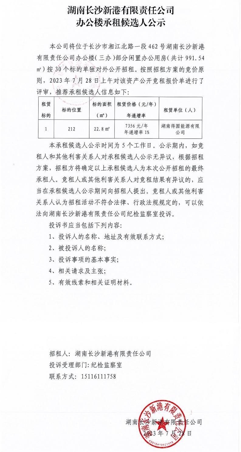 湖南長(cháng)沙新港有限責任公司辦公樓承租候選人公示