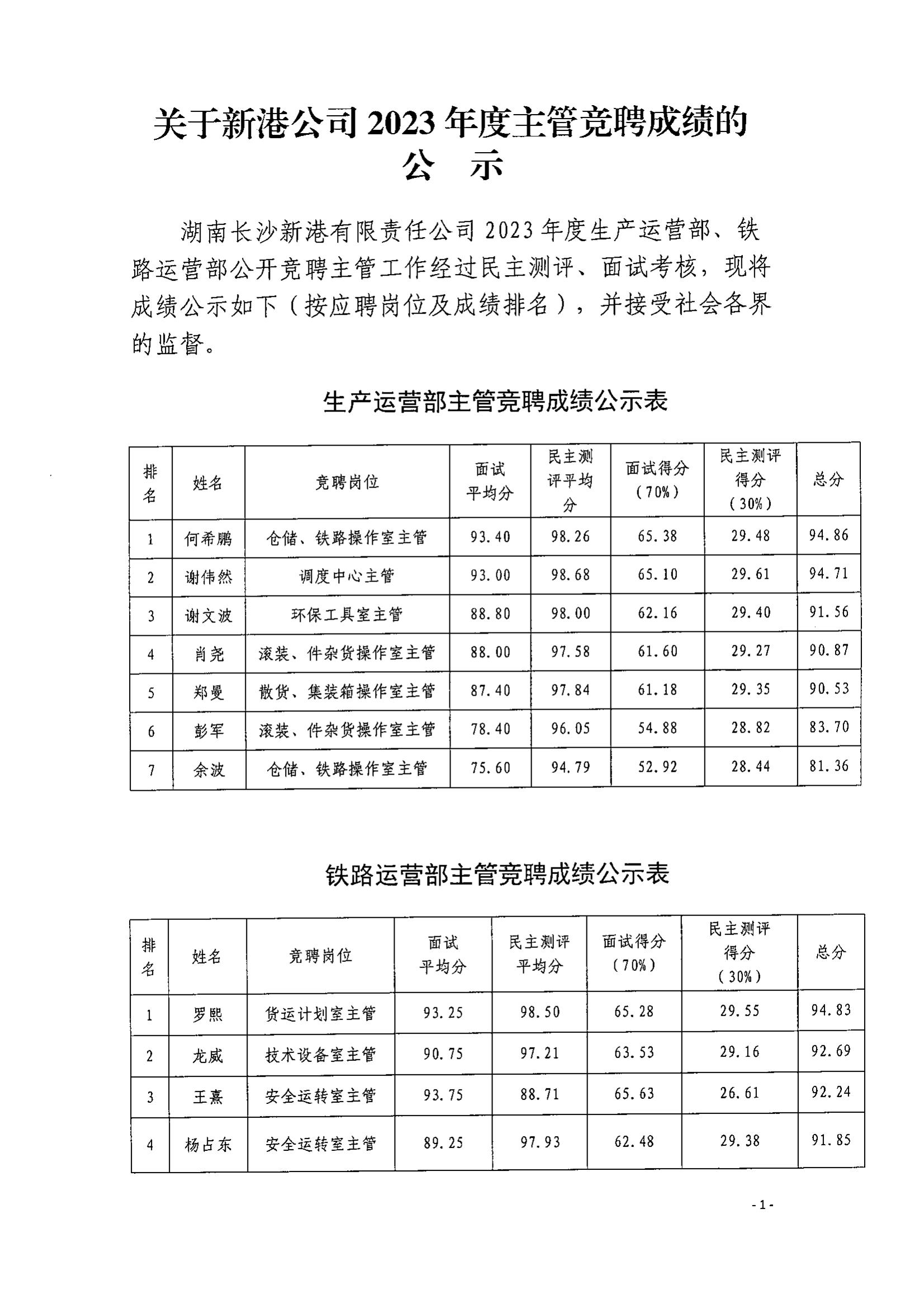 關(guān)于新港公司2023年度主管競聘成績(jì)的公示
