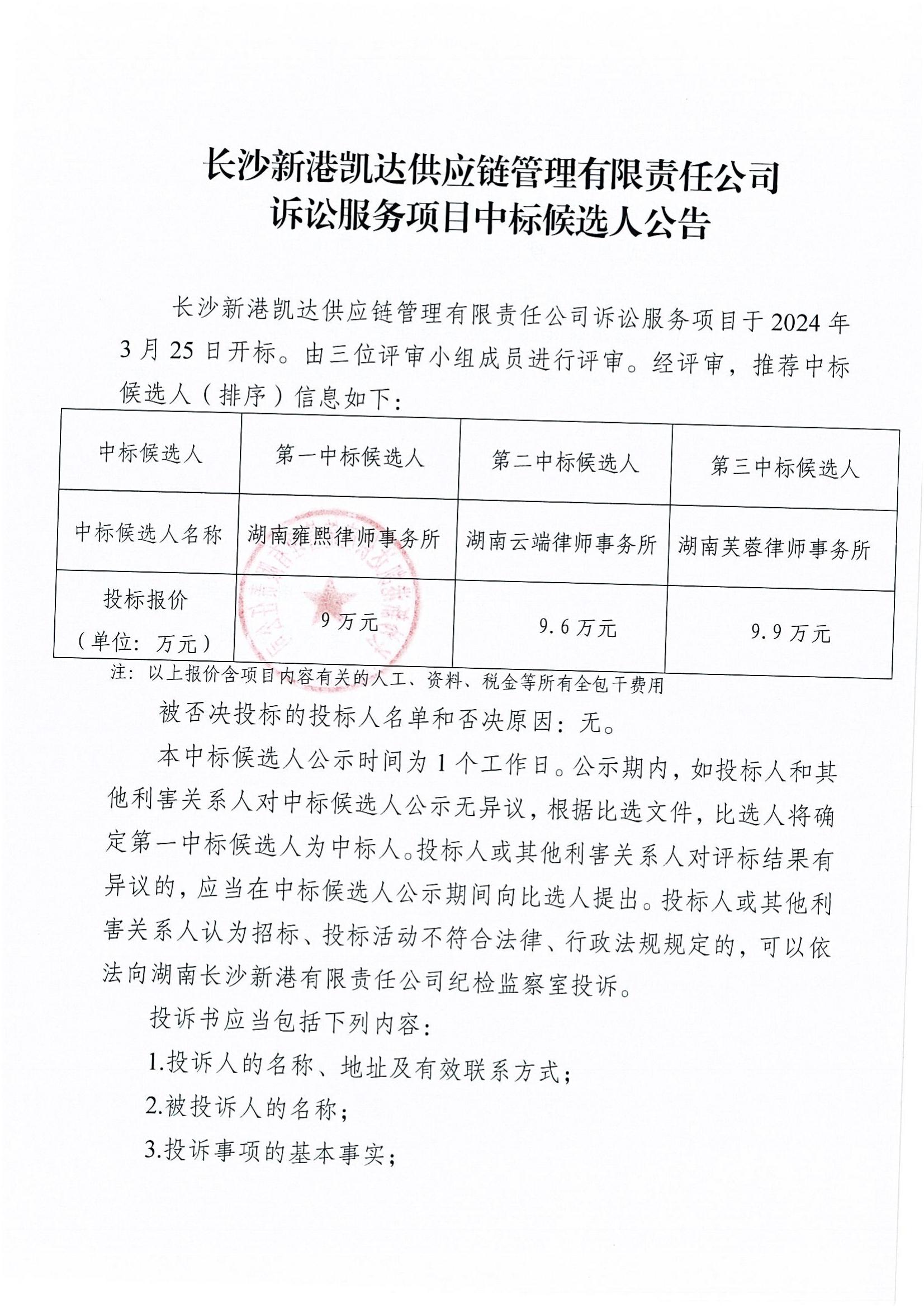長(cháng)沙新港凱達供應鏈訴訟服務(wù)項目中標候選人公告