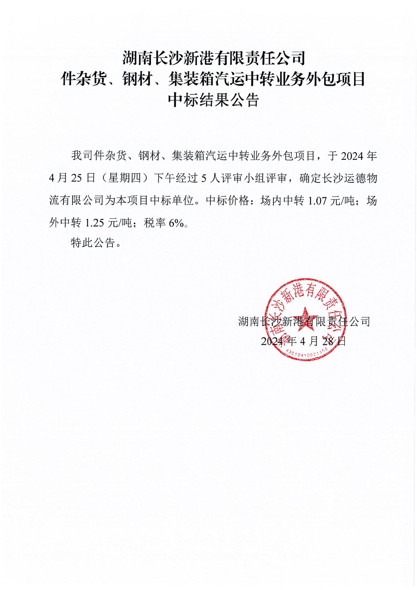 湖南長(cháng)沙新港有限責任公司件雜貨、鋼材、集裝箱汽運中轉業(yè)務(wù)外包項目中標結果公告