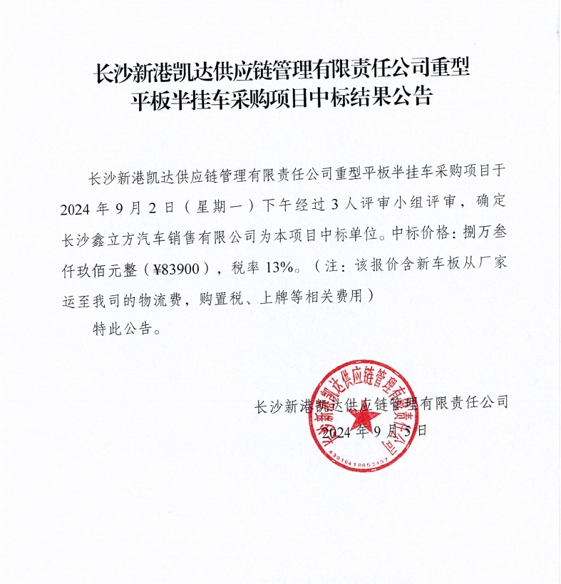 長(cháng)沙新港凱達供應鏈管理有限責任公司重型平板半掛車(chē)采購項目中標結果公告